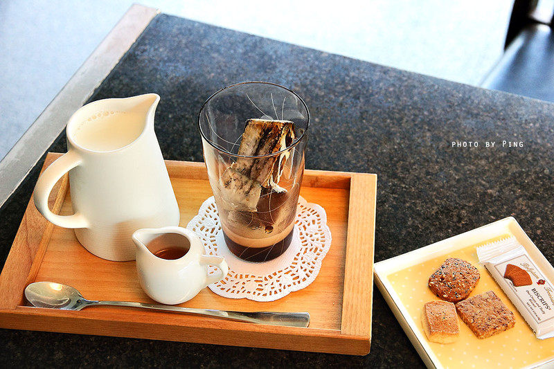 剛端上桌,很特別,就看到一壺鮮奶、糖蜜和一杯加有咖啡冰磚的玻璃杯,然後再配幾塊自家烘焙的手工小餅乾。